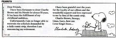 1999 - Charles M. Schulz announced he was retiring the "Peanuts" comic strip. The last original "Peanuts" comic strip was published on February 13, 2000.