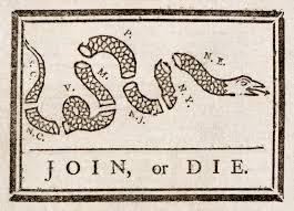 1754 - The first newspaper cartoon in America showed a divided snake "Join or die" in "The Pennsylvania Gazette."