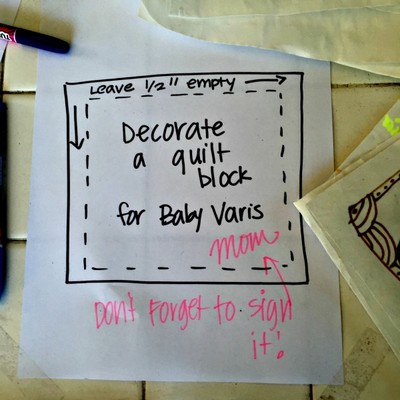 Provide a brief instruction diagram. Guests need to leave 1/2" empty around the edge of the blocks to allow for sewing (and you don't want their cool art to get cut off). I highly recommend you take the time to put 1/2" masking tape around the edge of each block. I didn't do this, and I regretted it when it came time to sew the blocks into a quilt.
