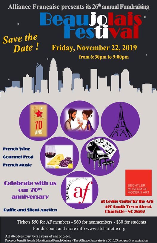 The Beaujolais Festival in Charlotte, North Carolina, is an authentic French tradition that celebrates the first grape harvest of the season, usually around the third week of November. The one-day annual event features wines from the region of Beaujolais, France as well as art exhibits, raffle prizes and gourmet pates, saucisson, cheeses and ham dishes from a decorated area chef.